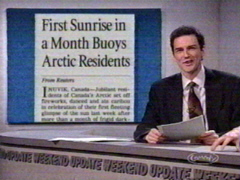 Last week, after more than a month of frigid darkness jubilant residents of Canada's artic set off fireworks, danced, and ate caribou in celebration of there first glimpse of sunlight. And as the sun briefly illuminated the sky they looked at each other and said, "Hey what the hell is this were eating? What is this caribou? ... I'm eating a hunk of caribou over here ... What the?" ... What is it.